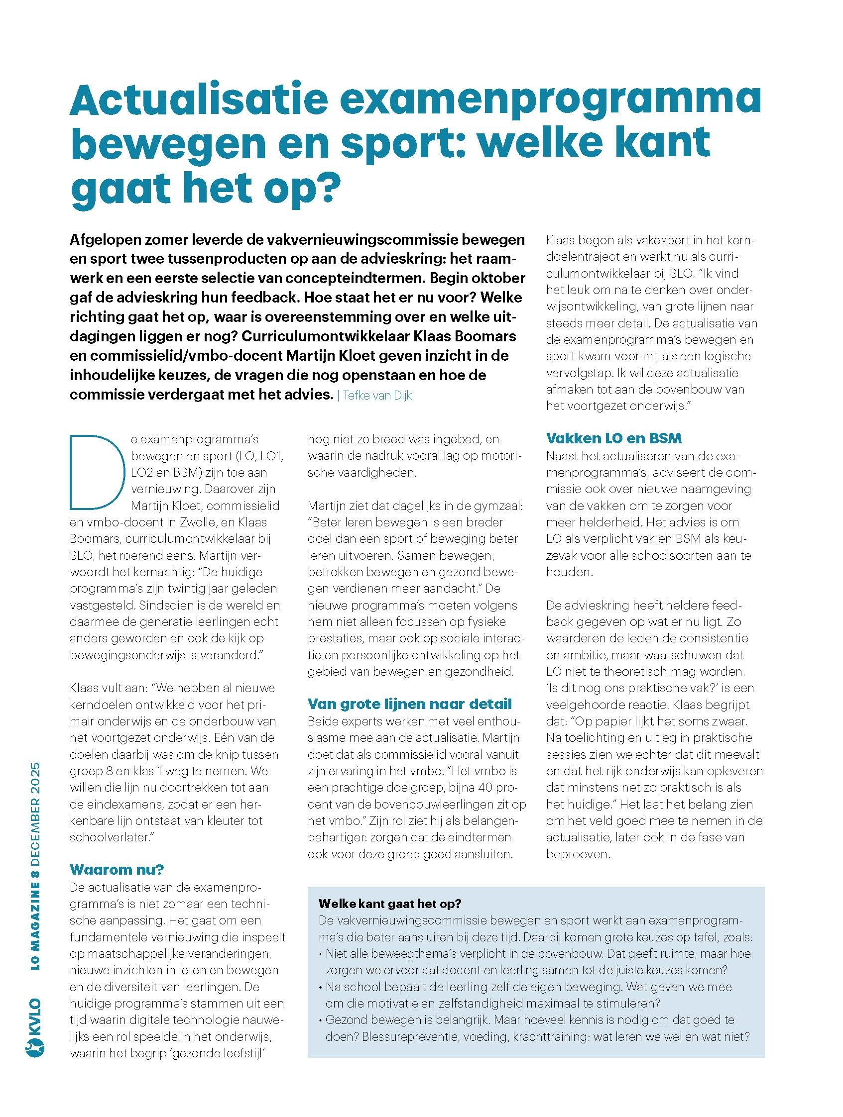 Welke richting gaat de actualisatie op? Waar is overeenstemming over en welke uitdagingen liggen er nog? In LO-magazine geven curriculumontwikkelaar Klaas Boomars en commissielid/vmbo-docent Martijn Kloet, inzicht in de inhoudelijke keuzes en de openstaande vragen. Ook vertellen ze hoe de commissie verder gaat het met advies van de advieskring.