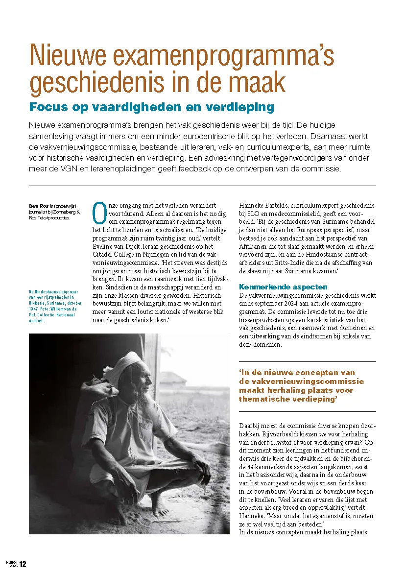 Nieuwe examenprogramma’s brengen het vak geschiedenis weer bij de tijd. De vakvernieuwingscommissie, bestaande uit leraren, vak- en curriculumexperts, werkt daarbij aan meer ruimte voor historische vaardigheden en verdieping. Een advieskring met vertegenwoordigers van onder meer de VGN en lerarenopleidingen geeft feedback op de ontwerpen van de commissie.