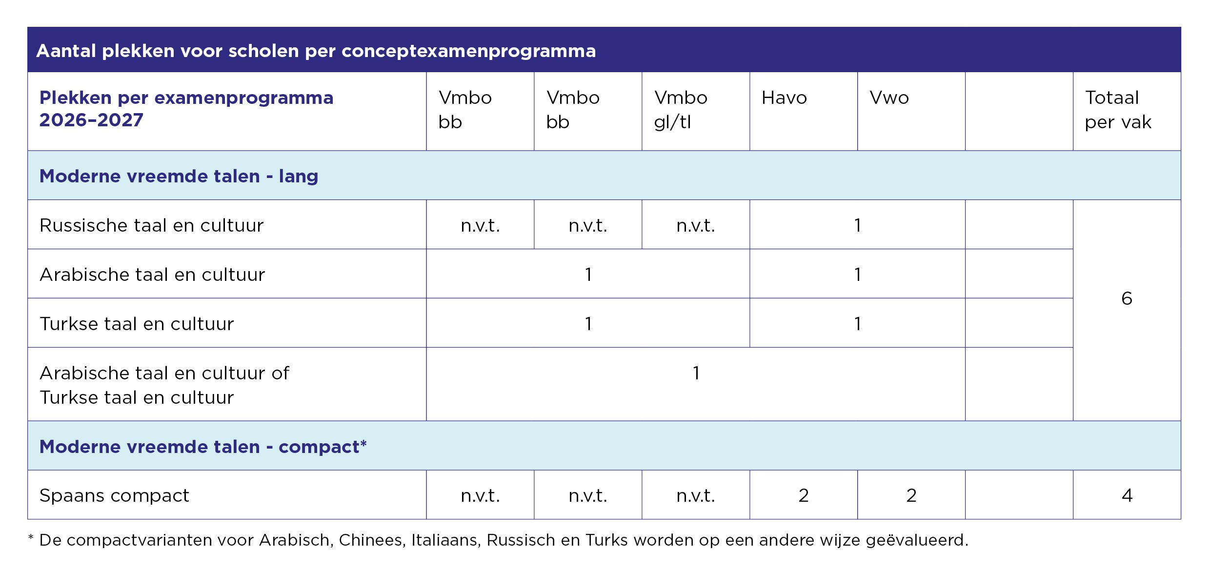 Dit geldt in schooljaar 2026-2027 voor Arabische en Turkse taal en cultuur op vmbo, havo en vwo en voor Russische taal en cultuur op havo-vwo. Meedoen betekent dat je als school onderzoekt in hoeverre de conceptexamenprogramma’s en conceptsyllabi begrijpelijk, bruikbaar en (verwacht) uitvoerbaar zijn.
