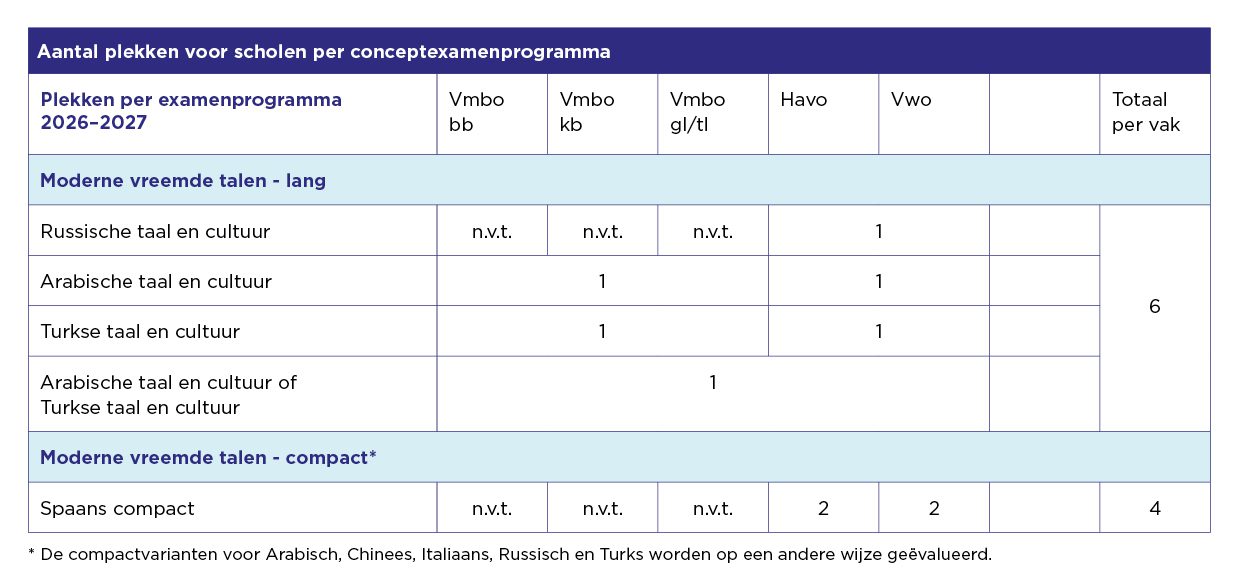 Voor de compactvarianten Arabisch, Chinees, Italiaans, Russisch en Turks op havo-vwo evalueren we de conceptexamenprogramma’s in een aantal bijeenkomsten. Informatie hierover komt later beschikbaar. Heb je belangstelling, mail dan naar beproevenexamenprogramma@slo.nl.