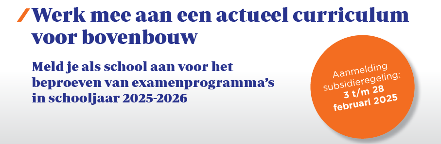 Meedoen betekent dat de school in schooljaar 2025-2026 voor één, twee of maximaal drie vakken per schoolsoort/leerweg onderzoekt in hoeverre de conceptexamenprogramma’s (en conceptsyllabi) bruikbaar en uitvoerbaar zijn. De subsidieregeling die hiervoor beschikbaar is opent vanaf 3 februari en loopt tot en met 28 februari 2025. Scholen horen uiterlijk 30 mei of ze mee kunnen doen.