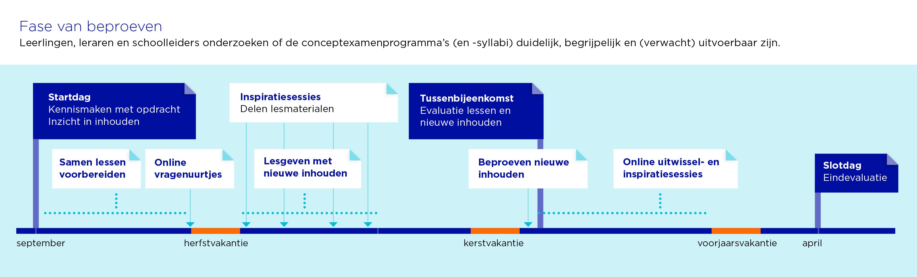 Deze conceptexamenprogramma's beproeven we in schooljaar 2026-2027, samen met leraren, leerlingen en schoolleiders en collega's van CvTE en Stichting Cito.