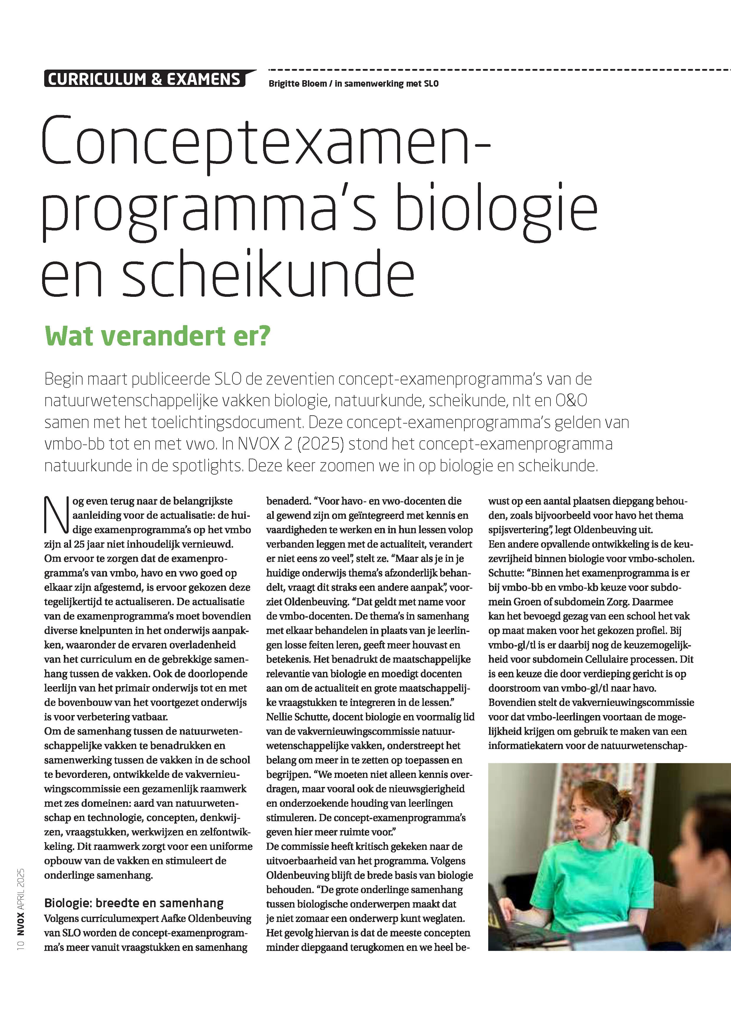Begin maart publiceerde SLO de zeventien conceptexamenprogramma’s van de natuurwetenschappelijke vakken biologie, natuurkunde, scheikunde, nlt en O&O samen met het toelichtingsdocument. In een artikel in NVOX4 vertellen curriculumontwikkelaars van SLO en leden van de vakvernieuwingscommissie over de conceptexamenprogramma’s biologie en scheikunde. Welke keuzes zijn gemaakt? Waar zitten de grootste veranderingen? En wat betekent dit straks voor leraren en leerlingen?