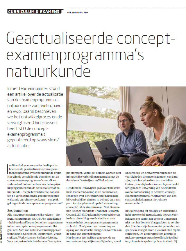 Hoe zien de conceptexamenprogramma’s voor natuurkunde eruit? Hoe zijn de verschillende domeinen uit de conceptexamenprogramma’s met elkaar verbonden? En hoe hebben vier belangrijke uitgangspunten van de actualisatie voor natuurkunde – diepte boven breedte, aansluiten bij vervolgonderwijs, gedifferentieerde wiskunde en ruimte voor keuze – een plek gekregen in de conceptexamenprogramma’s? In NVOX 6 geeft Erik Woldhuis (curriculumexpert bij SLO) antwoord op deze vragen.