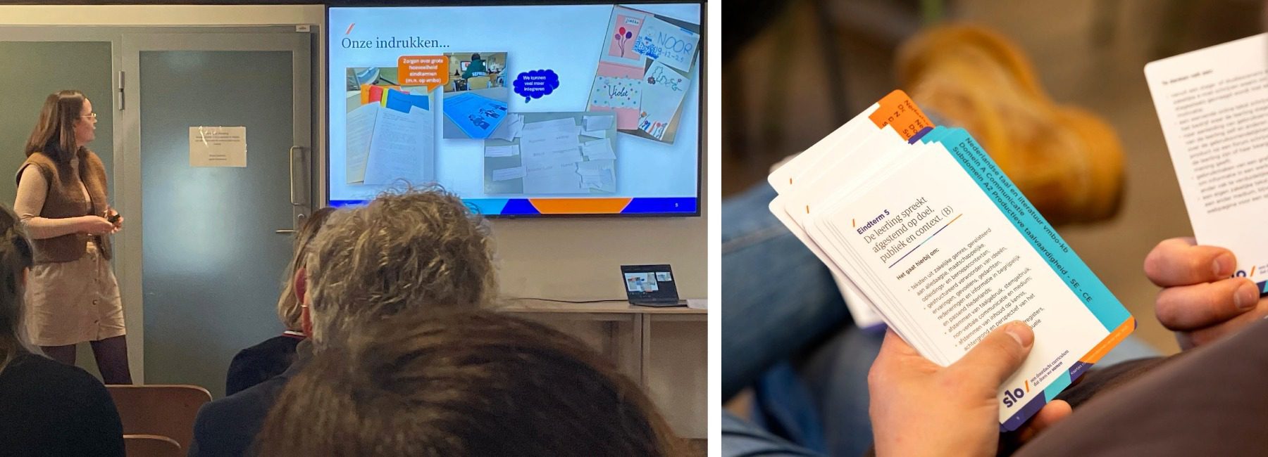 Na een gezamenlijke lunch gingen we in groepen uiteen. De ene helft evalueerde in focusgroepen het eerste blok en de andere helft sprak met elkaar over het verschil tussen beheersings- en ervaringsdoelen en de beoordeling daarvan. Dit leverde interessante inzichten en goede vragen op: wanneer beheerst een leerling een eindterm nou voldoende? En hoe zorgen we voor een doorlopende leerlijn bij nieuwe eindtermen als creatief taalgebruik en taalvariatie? Hoe neem je ervaringsdoelen op in je PTA en hoe beoordeel je die dan? Halverwege de middag wisselden de groepen elkaar af.
